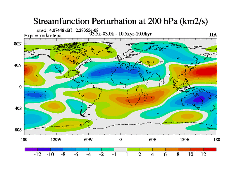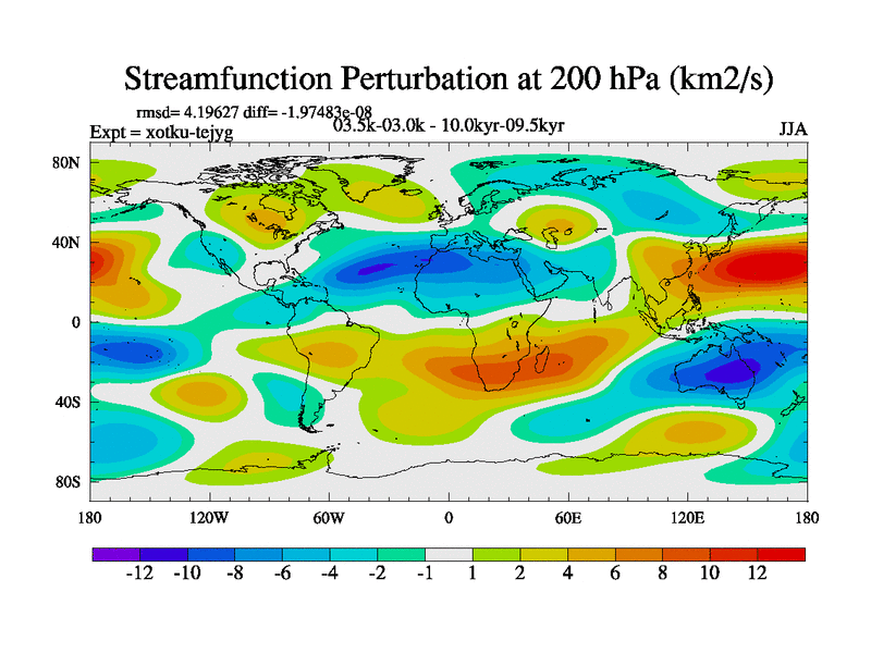 This is part of Birmingham Holocene simulations. This is the CONV-VMS configuration which includes changes to entrainment rate, detrainment and vegetation moisture stress. All forcings included except melt water fluxes. This series originally started from the tdphl spinup. Revised runoff maps, Russian rivers to Arctic. Solar and volcanic forcing is included.